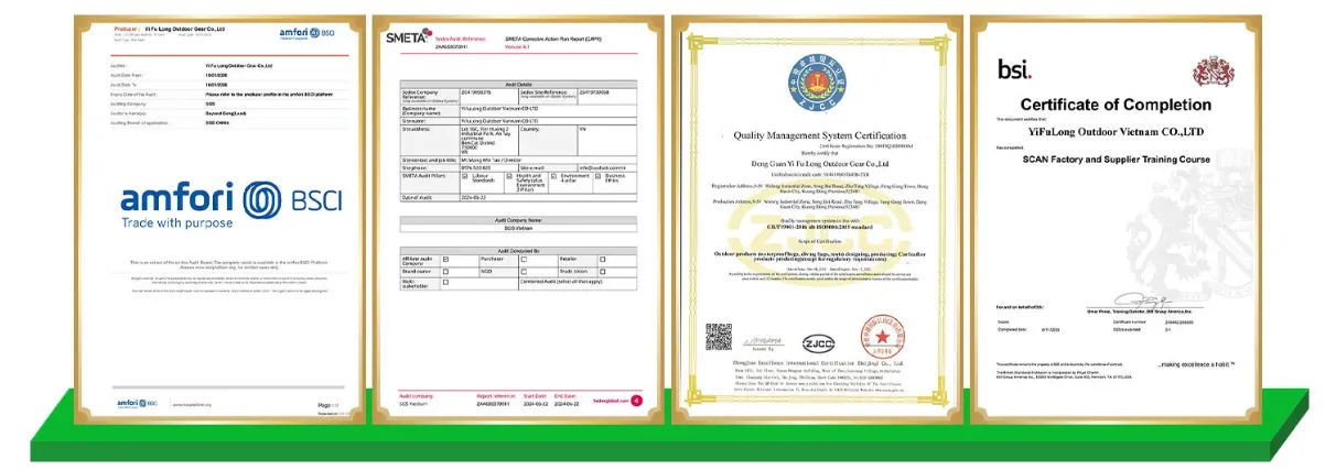 Postupně jsme získali řadu autoritativních certifikací, včetně ISO 9001 pro management kvality, BSCI/SMETA pro společenskou odpovědnost a Higg Index pro udržitelnost životního prostředí.